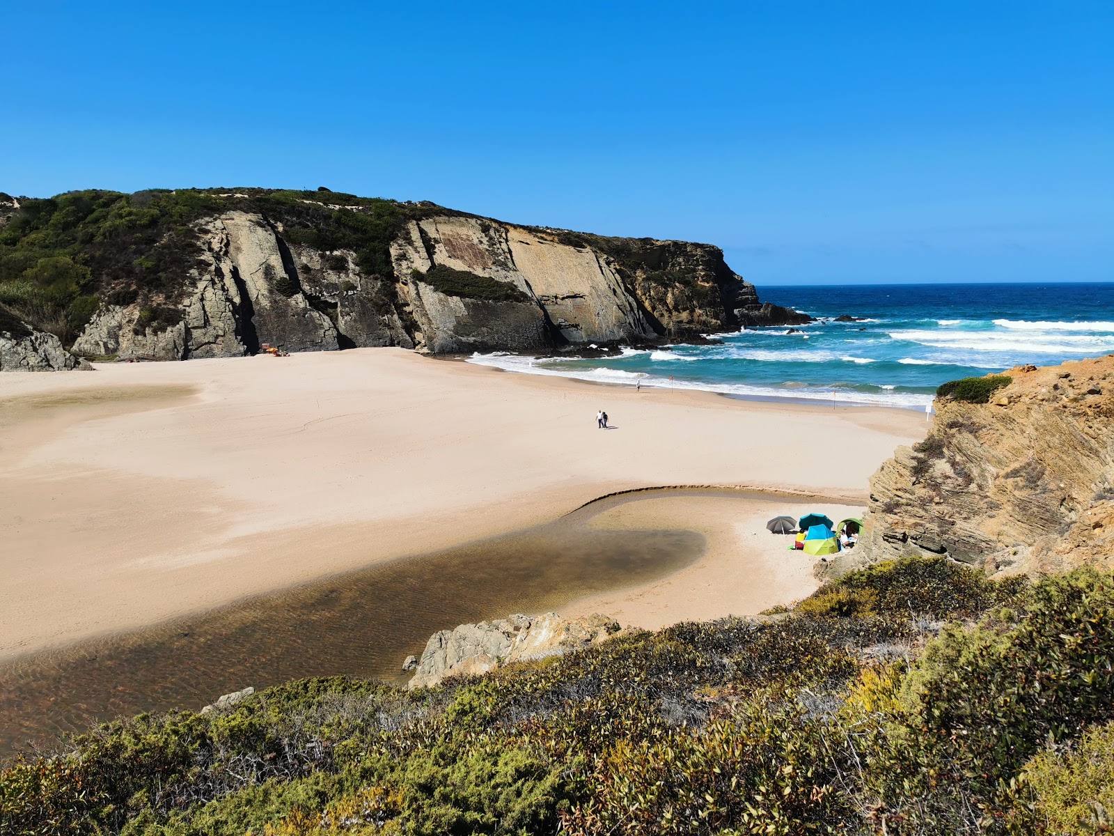 Iets verder bij Portugal Nature Lodge vandaan en maar een klein strandje maar oh zo mooi gelegen als baaitje tussen de hoge kliffen. Met een surfschool en een bar, populair bij campers, maar toch nog heel relaxed. Mooi te combineren met Zambujeira do Mar, dat iets noordelijker ligt.